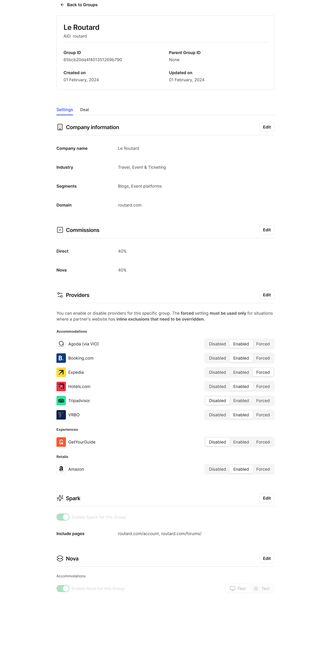 A scalable group-management experience for internal operators: table-first list view, drill-down details, and section-by-section edits for company settings, commissions, provider rules, and Spark rollout targeting—built with light/dark parity.