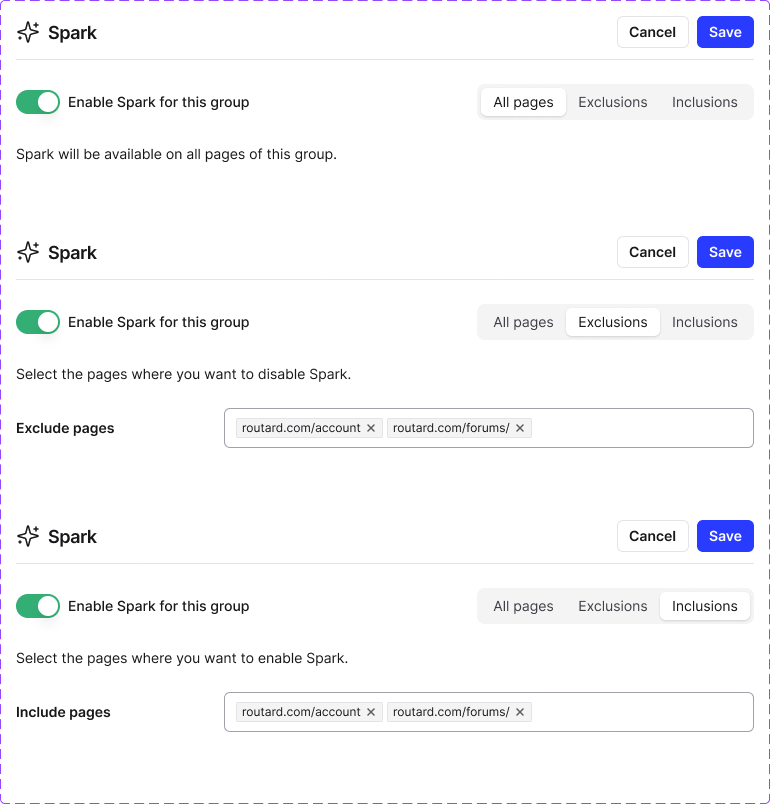 - Added a simple targeting model for Spark rollouts (all pages vs exclusions vs inclusions) using compact chip inputs.